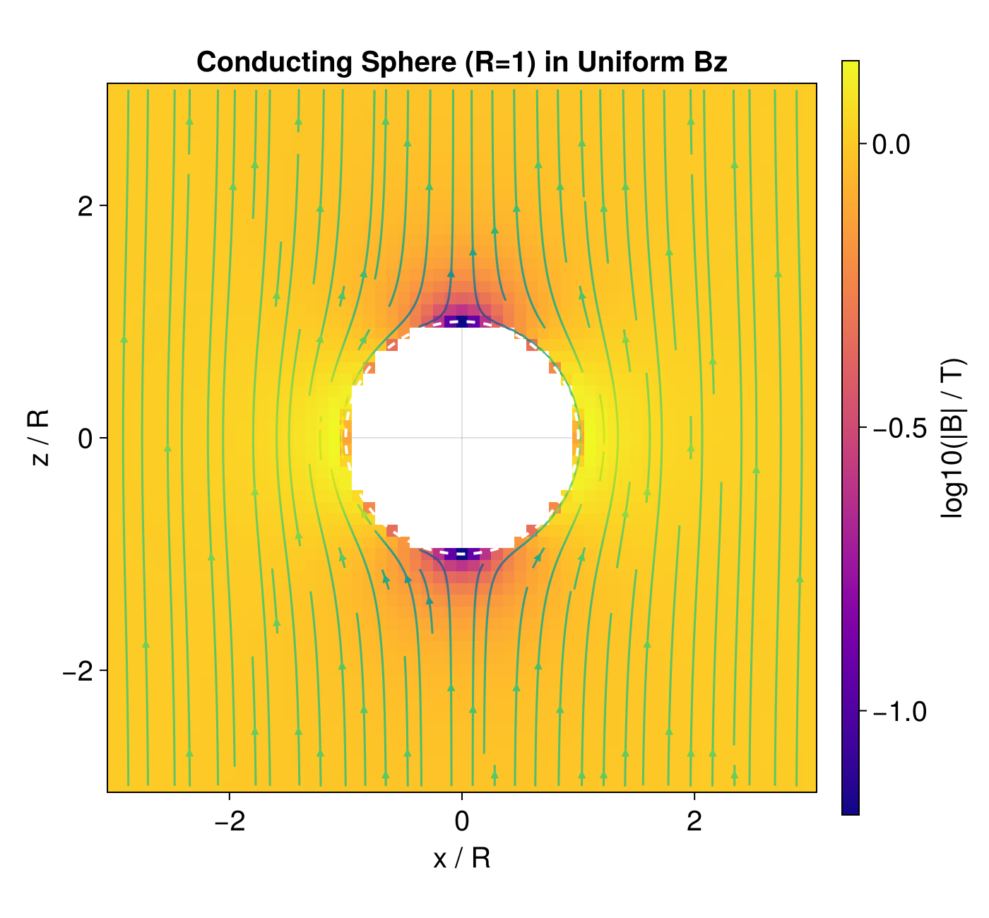 println("max |Bz| at wall: ", maximum(abs, Bz_at_wall))max |Bz| at wall: 2.571778923433936e-13Conducting Sphere in a Uniform Background Field