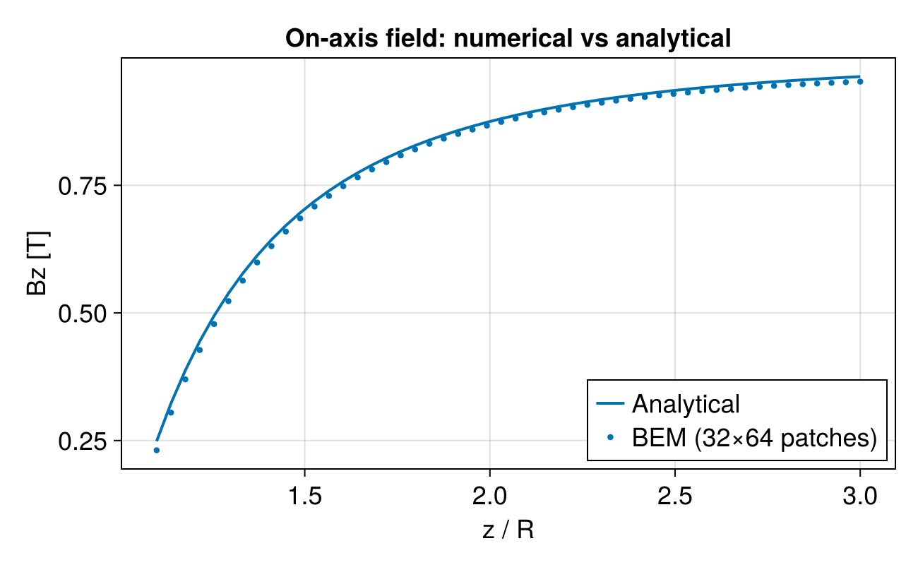 scatter!(ax3, zs_axis ./ R, Bz_num; label="BEM (32×64 patches)", markersize=6)