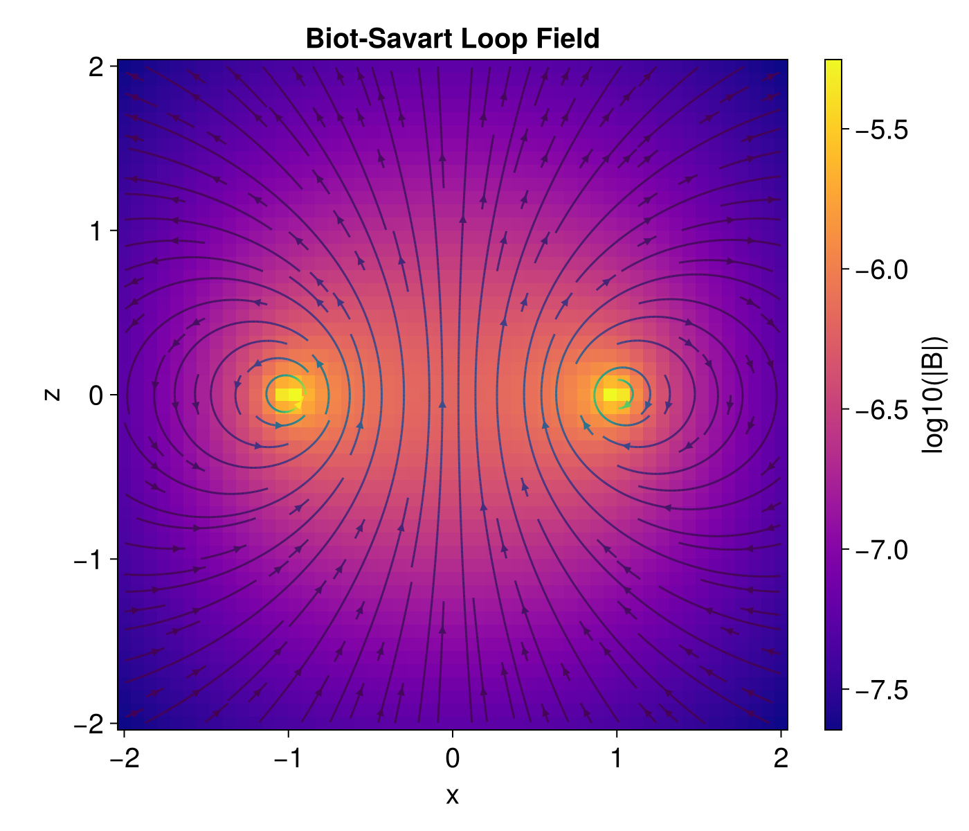 hm = heatmap!(ax, xs, zs, log10.(Bmag .+ 1e-9), colormap=:plasma)
