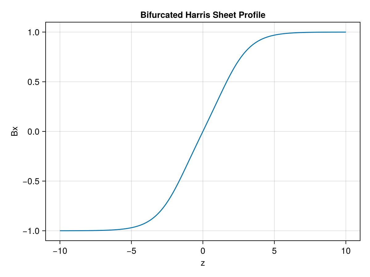 ax = Axis(fig[1, 1], xlabel="z", ylabel="Bx", title="Bifurcated Harris Sheet Profile")