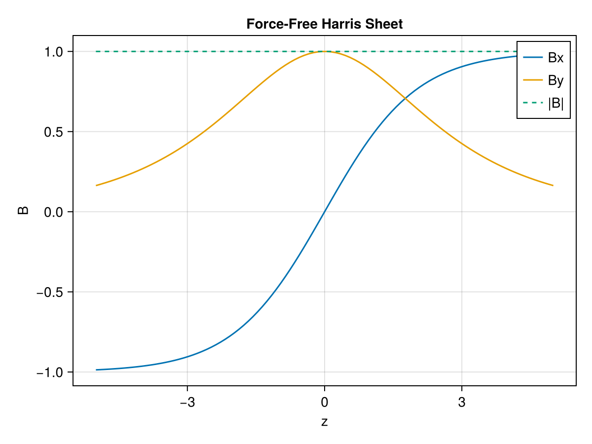 ax = Axis(fig[1, 1], xlabel="z", ylabel="B", title="Force-Free Harris Sheet")