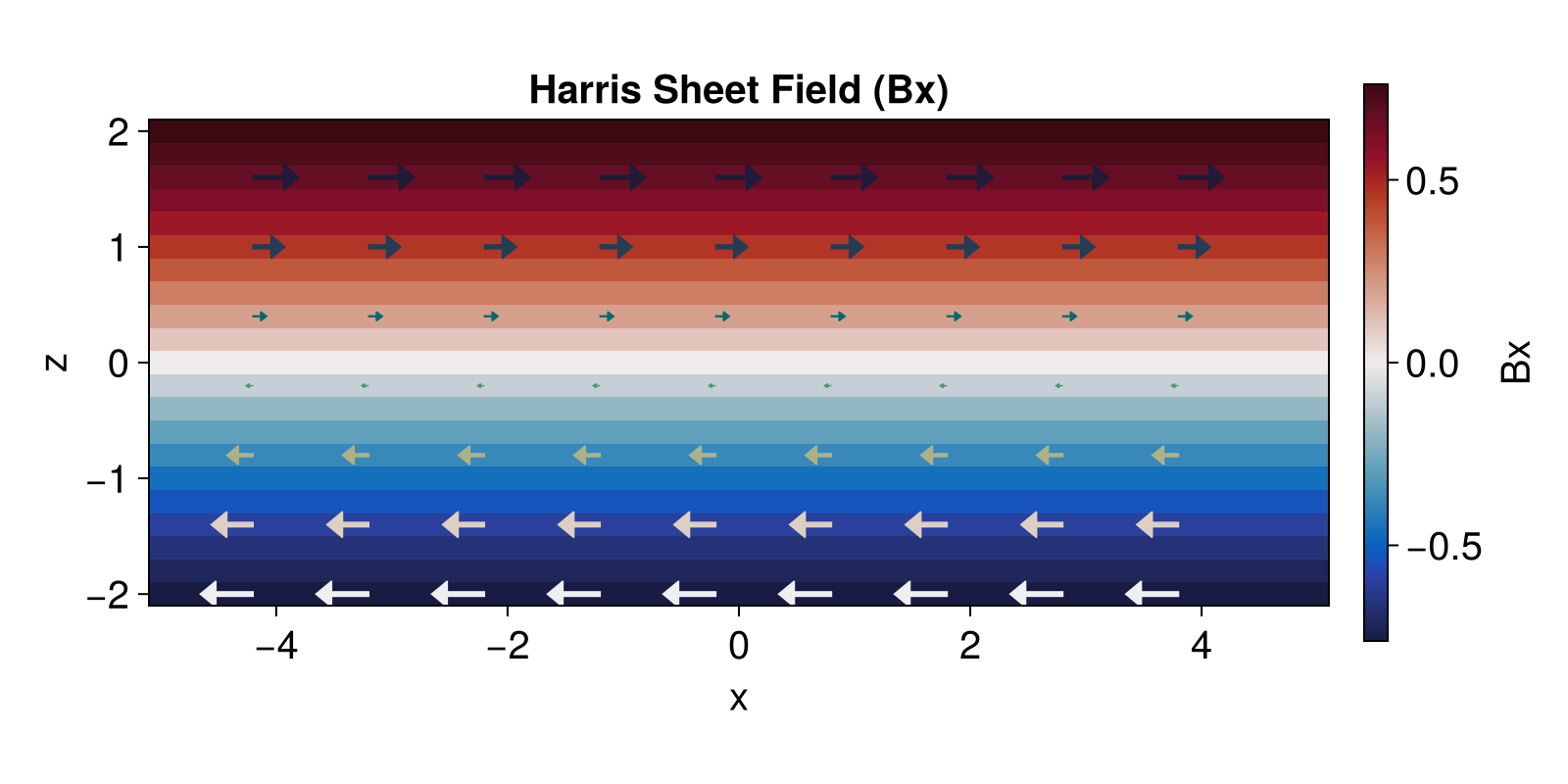 xlabel="x", ylabel="z", aspect=DataAspect(), title="Harris Sheet Field (Bx)")