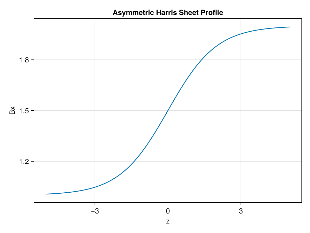 ax = Axis(fig[1, 1], xlabel="z", ylabel="Bx", title="Asymmetric Harris Sheet Profile")