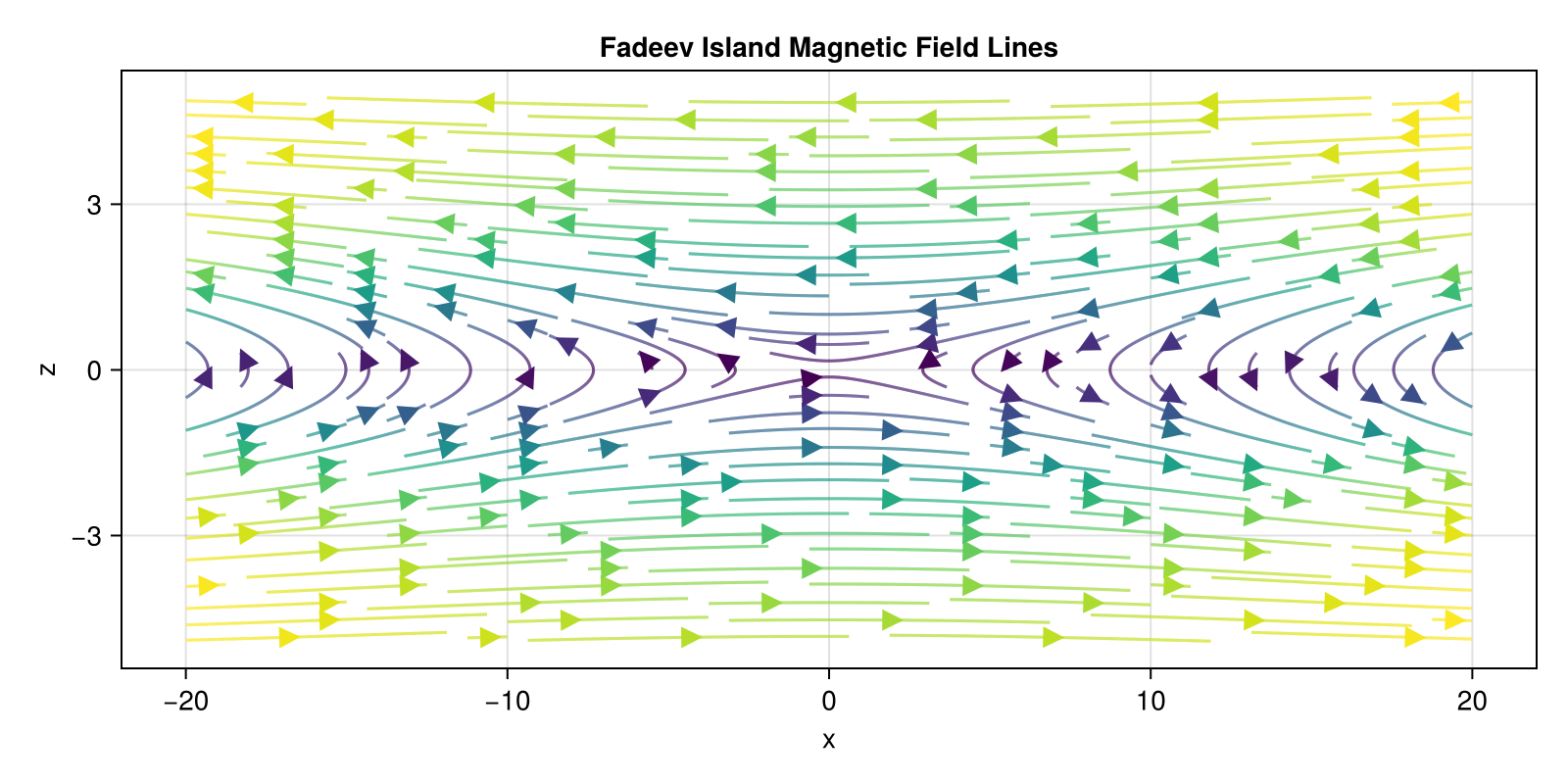 ax = Axis(fig[1, 1], xlabel="x", ylabel="z", title="Fadeev Island Magnetic Field Lines")