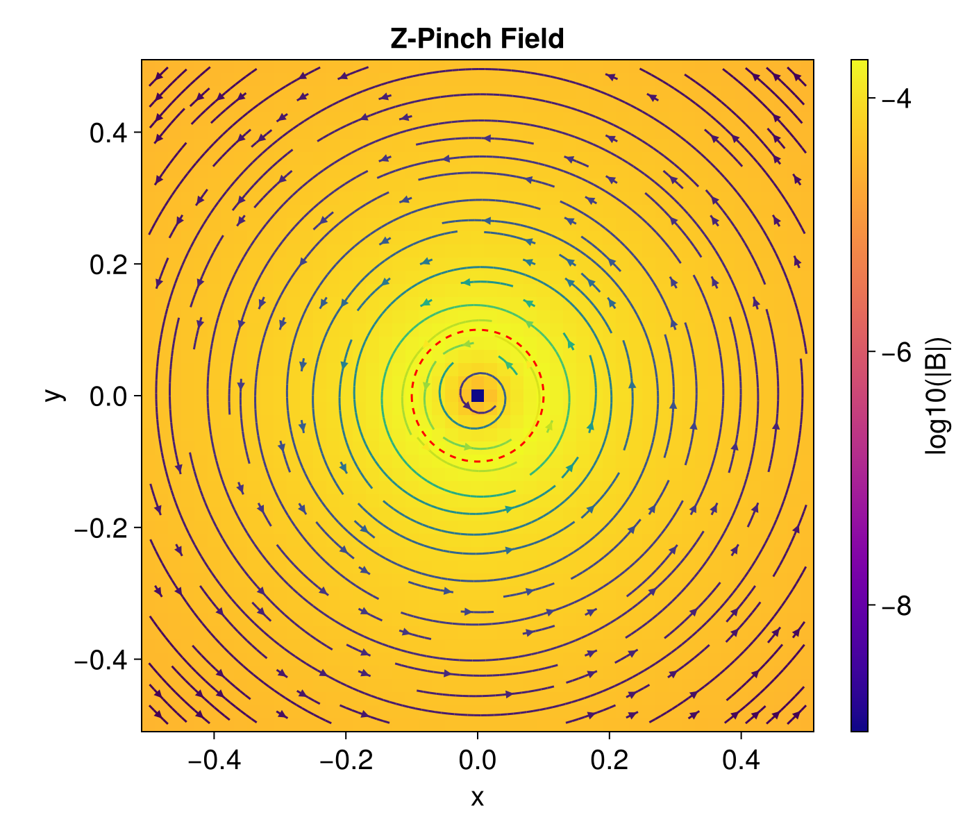 ax = Axis(fig[1, 1], xlabel="x", ylabel="y", aspect=DataAspect(), title="Z-Pinch Field")