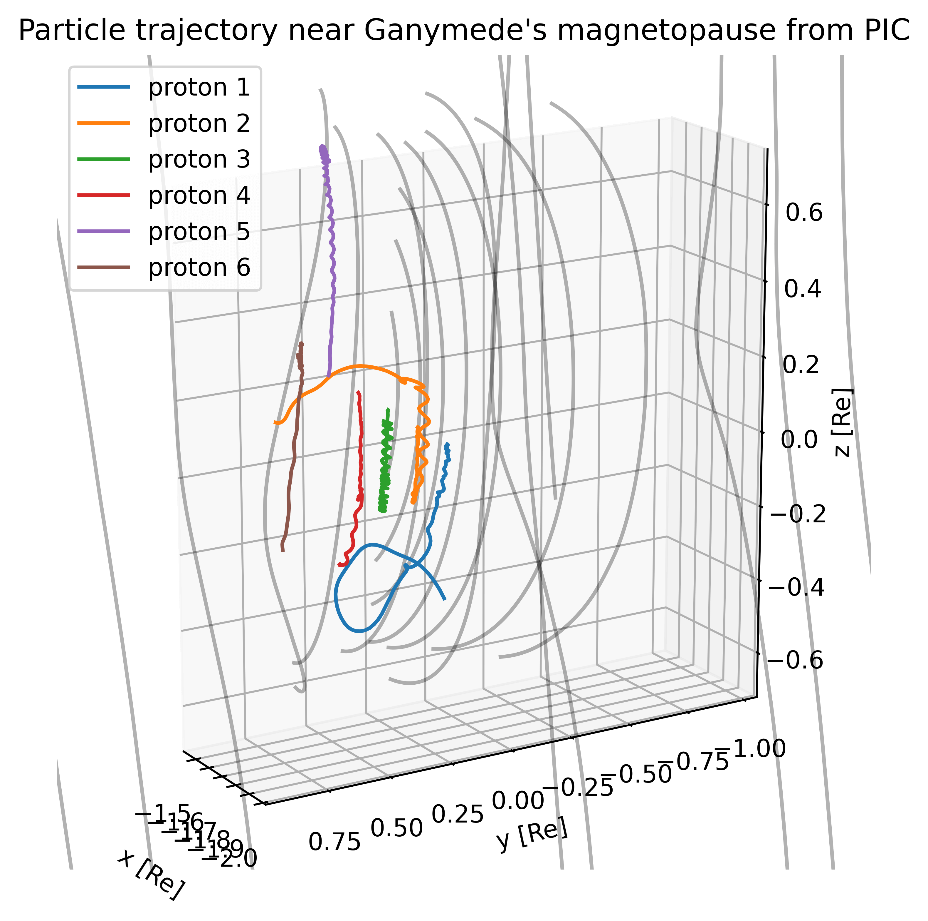 title("Particle trajectory near Ganymede's magnetopause from PIC")