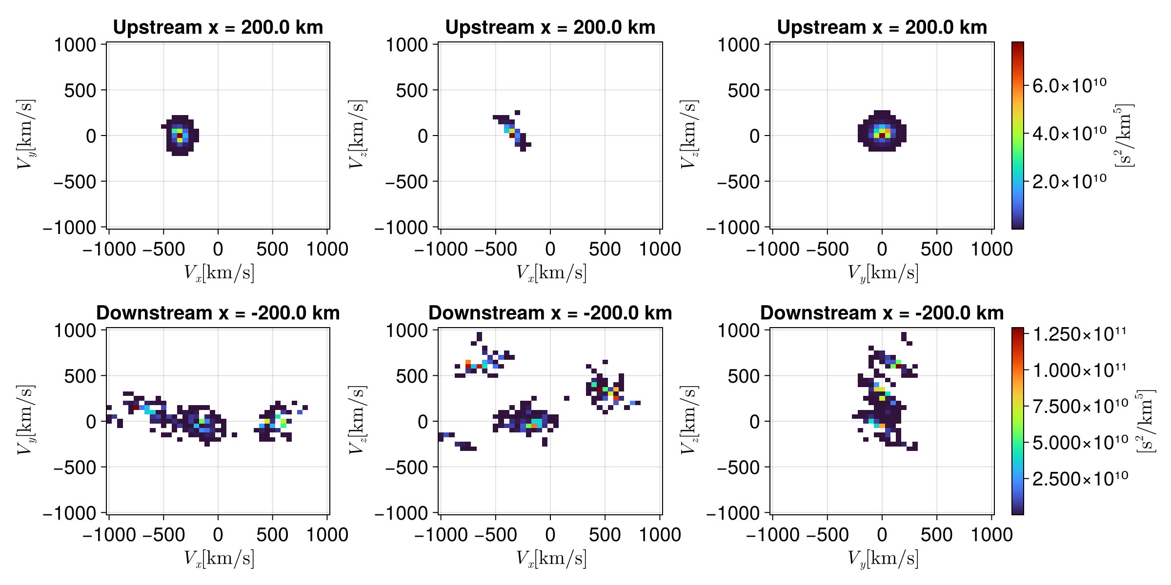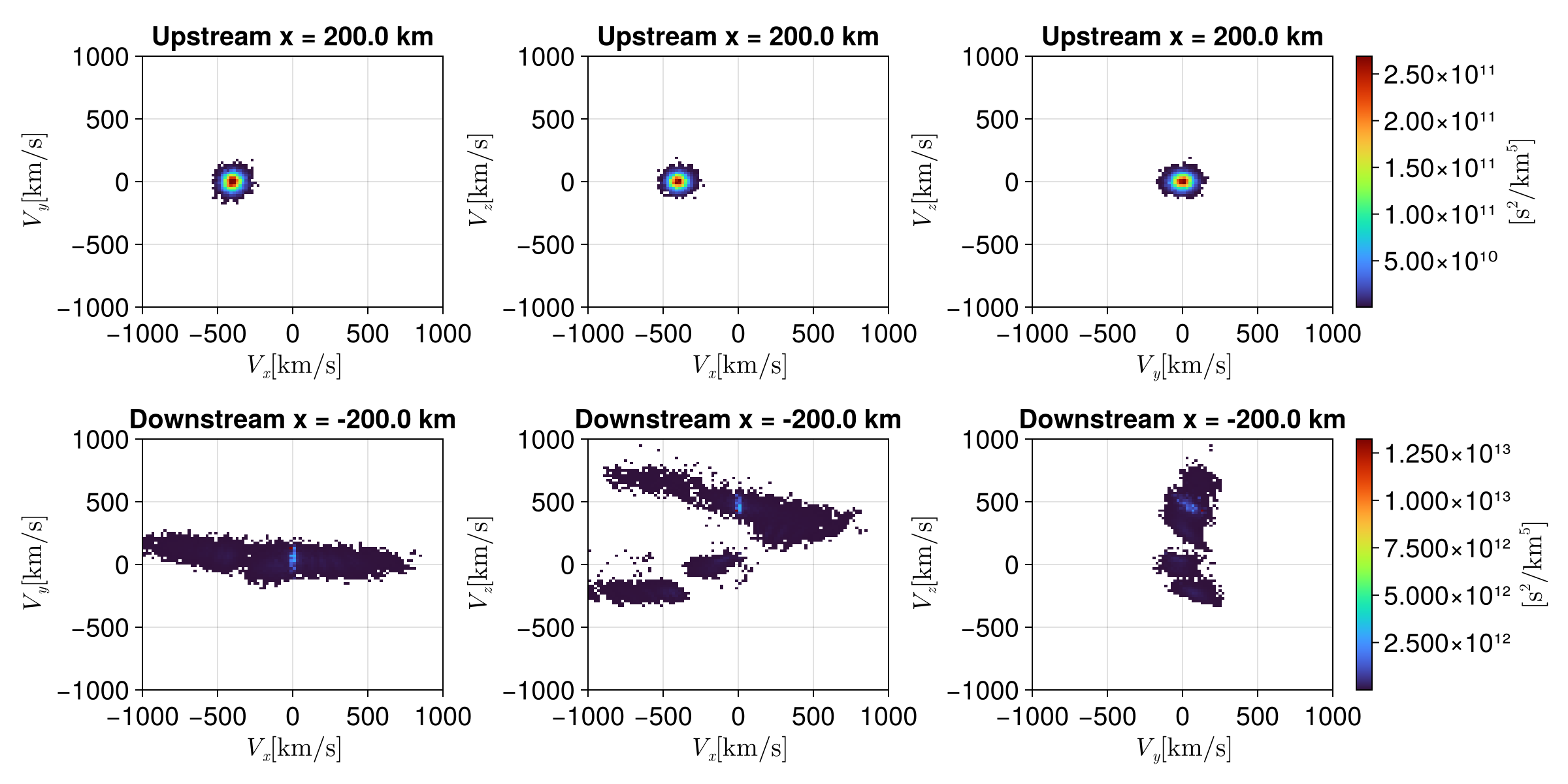 fig_forward = plot_shock_vdf(hists_up_m2, hists_down_m2, x_upstream, x_downstream)