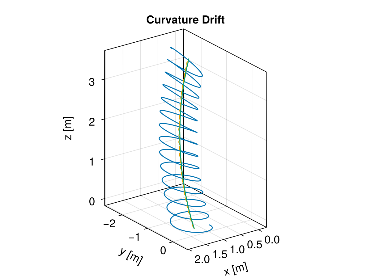 This example demonstrates a single proton motion under a vacuum non-uniform B field with gradient and curvature. The analytic calculation includes the grad-B drift, the curvature drift, the ExB drift and parallel velocity. More theoretical details can be found in Curvature Drift and Computational Plasma Physics by Toshi Tajima.