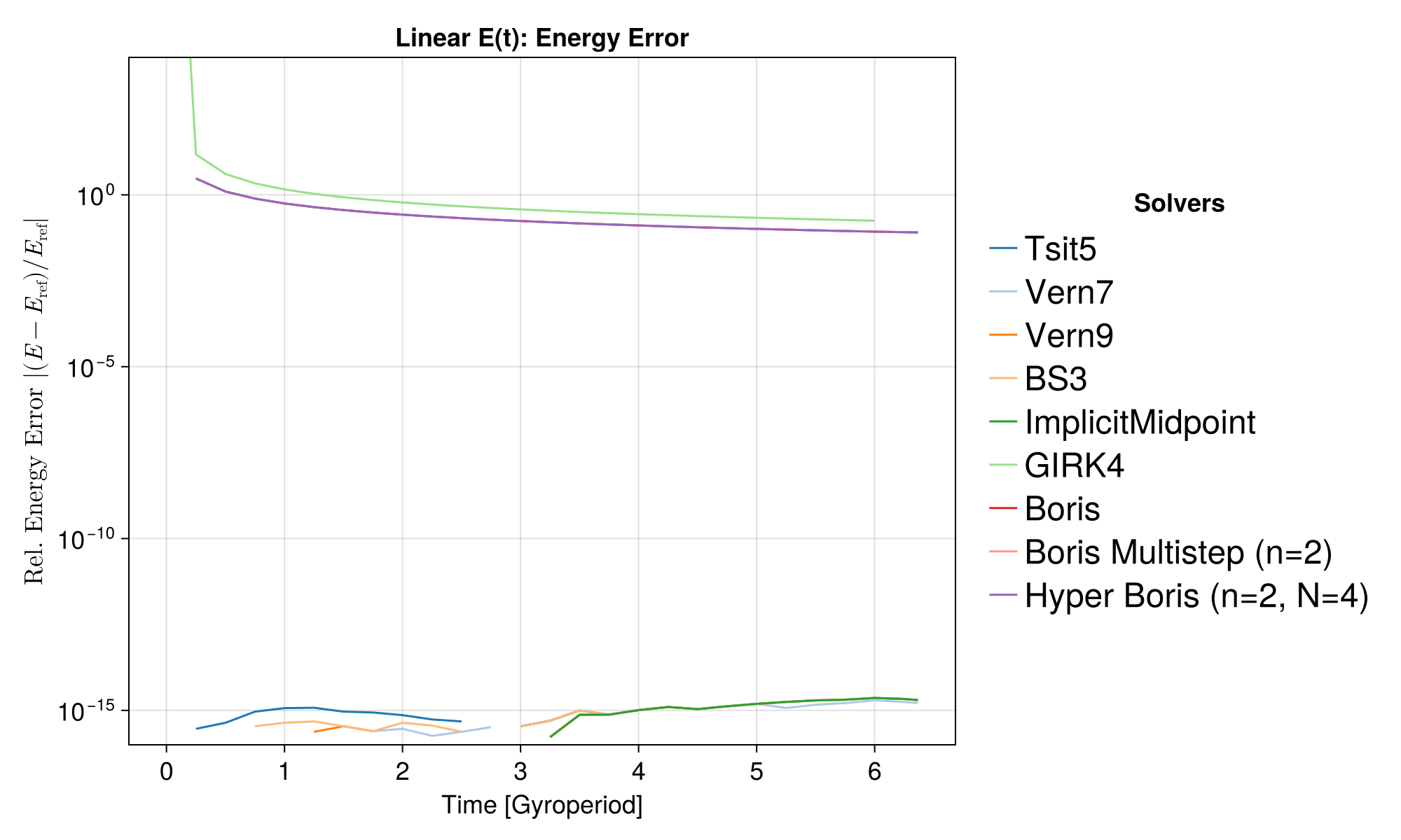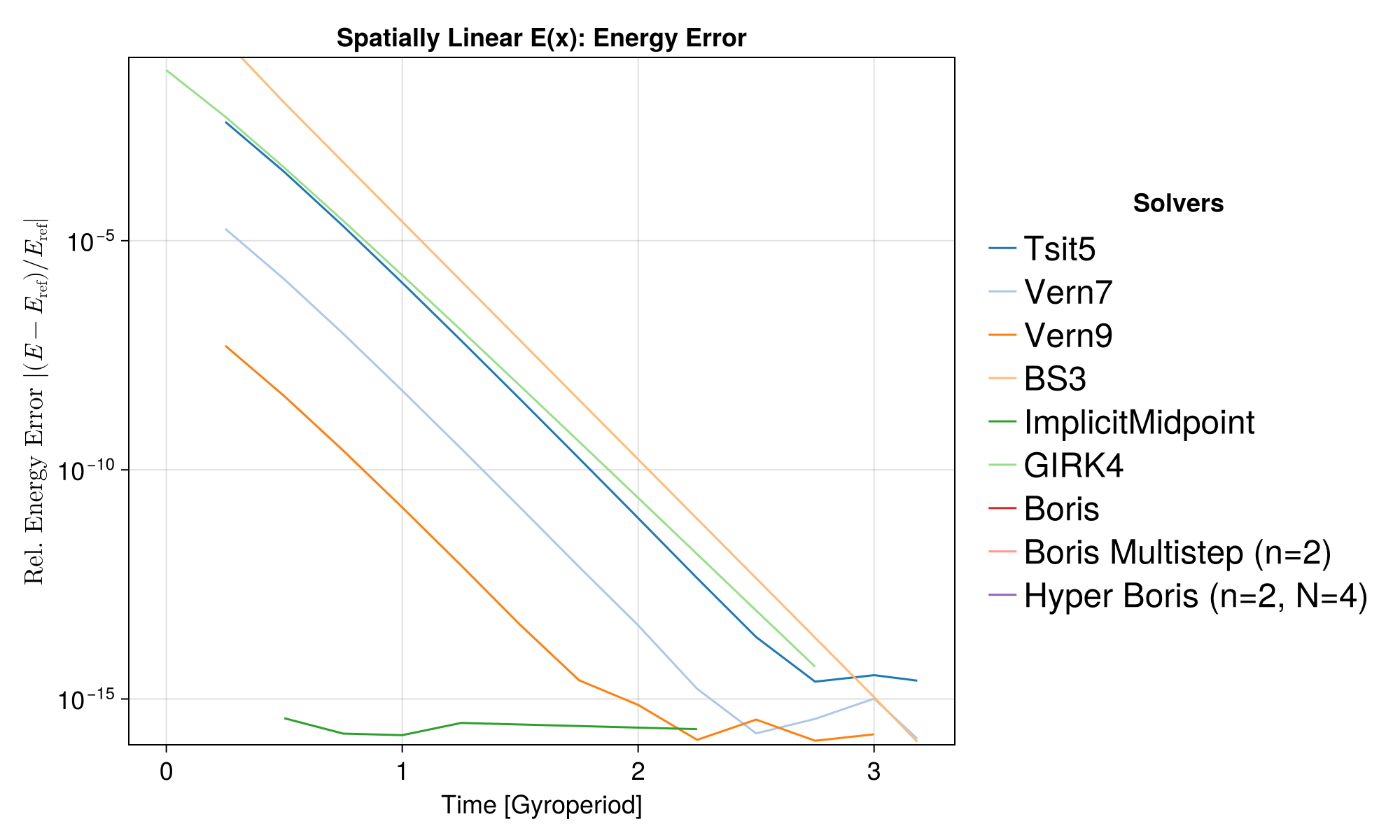 The Boris solvers systematically show a large error in this case. This is because Boris evaluates the electric field at the integer time step