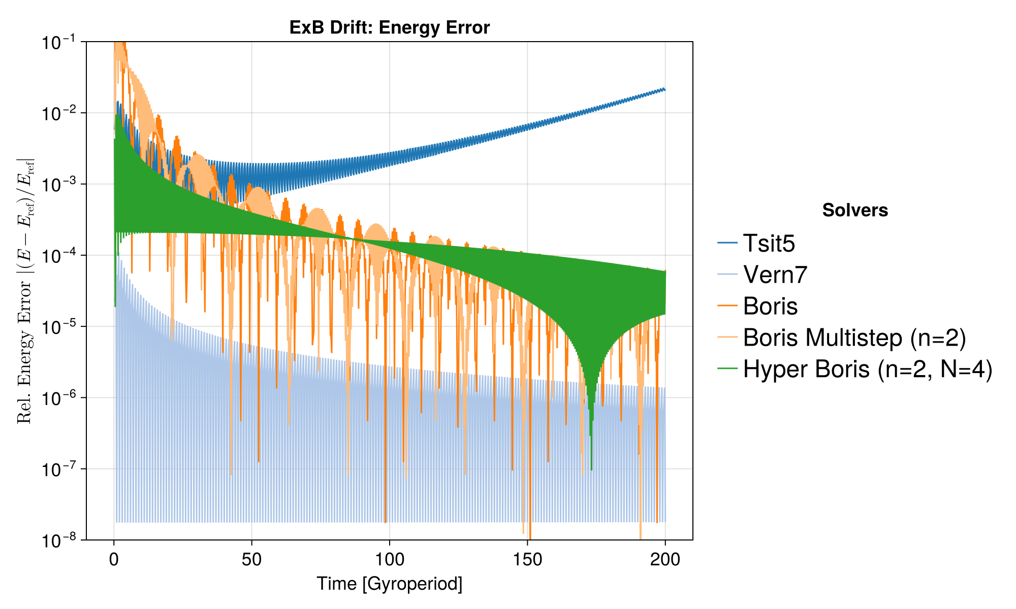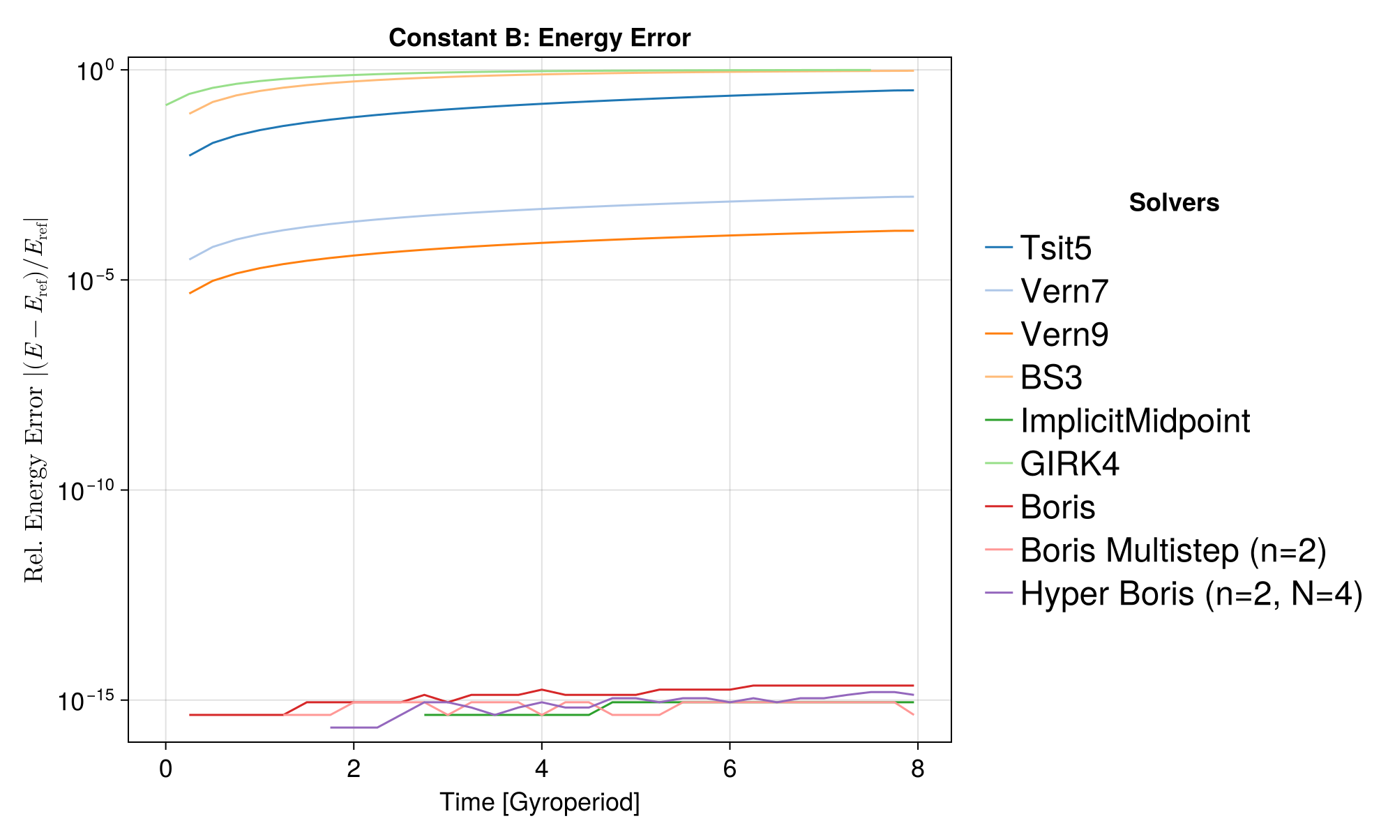 Similar to Case 2a, the Boris solvers systematically show a large error in this case, because of the initial half-step offset.