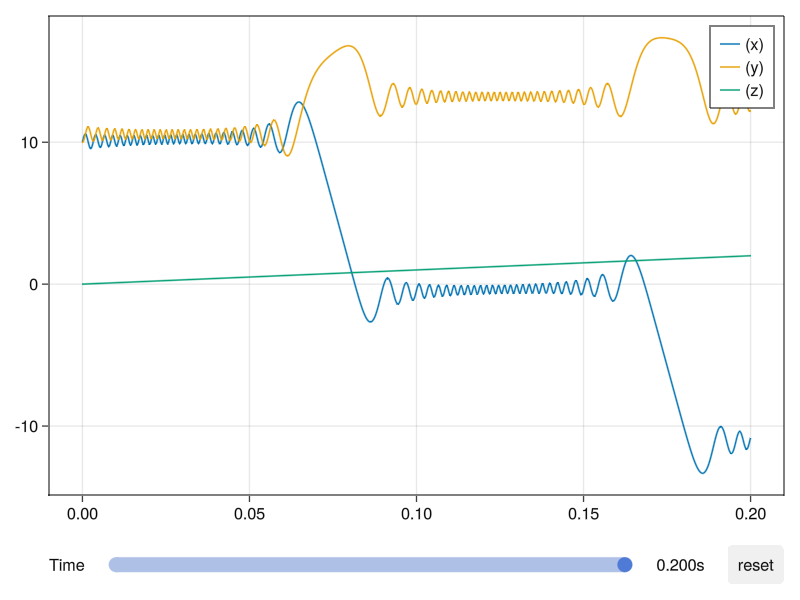 plot!(sol, idxs=(1, 2, 3))Multiple particle trajectories saved as the type EnsembleSolution is also supported by the Makie recipe.