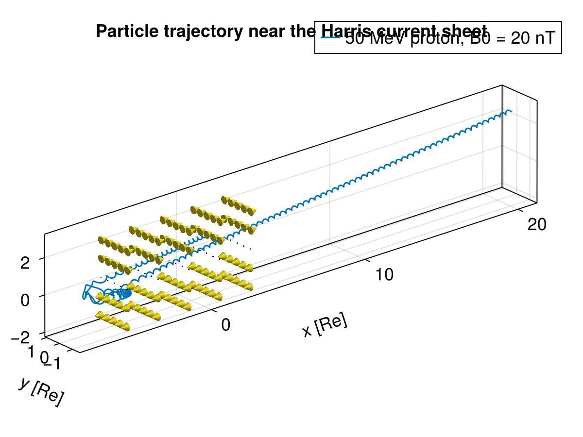 title = "Particle trajectory near the Harris current sheet",