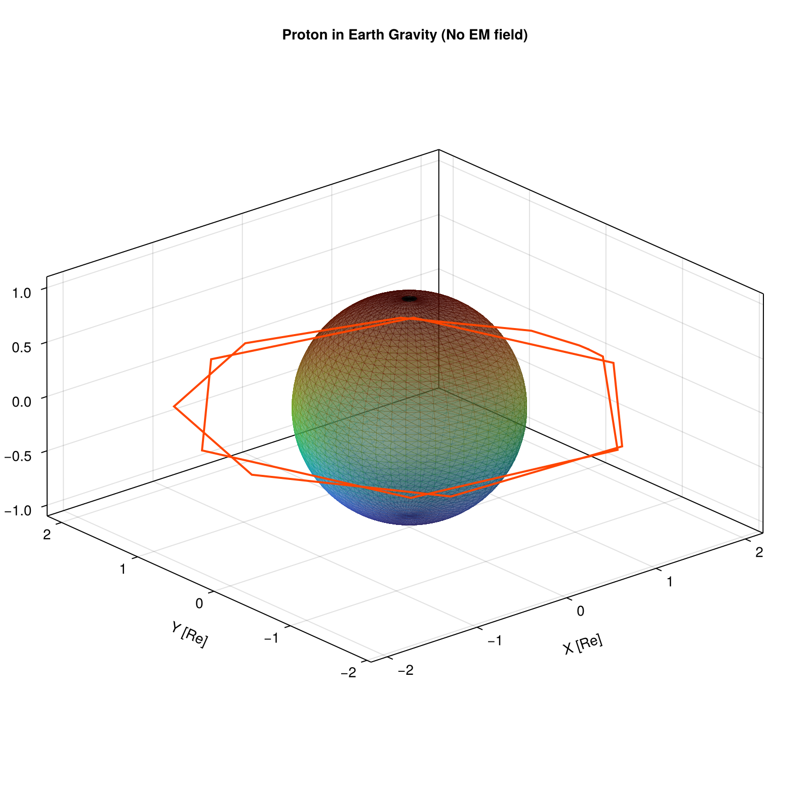 This example demonstrates tracing a proton motion with only an Earth-like gravity field provided in the external field F.