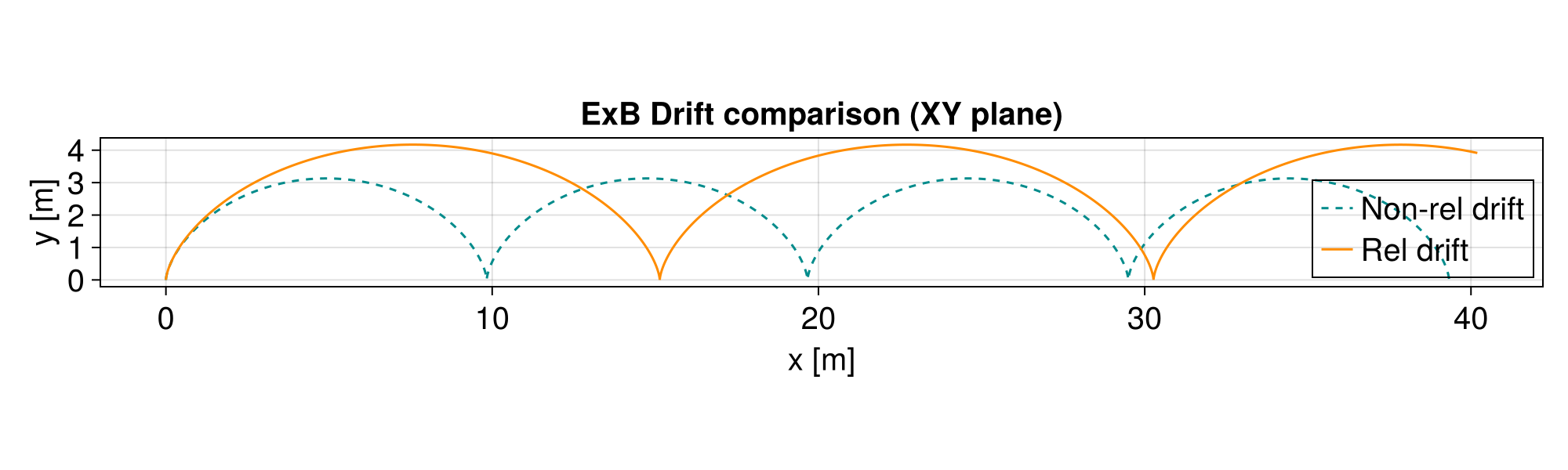 param2 = prepare(getE2, getB2; species = Proton);Test with a single high initial velocity perpendicular to drift to see the cycloid differences. Starting from rest: Non-relativistic: cycloid with peak velocity 2*v_drift. Relativistic: should also drift but with different dynamics.