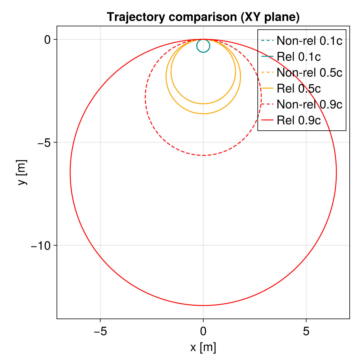 Observation: At 0.1c, the dashed and solid lines almost overlap. At 0.9c, the relativistic trajectory (solid) has a significantly larger radius, consistent with the factor of γ ≈ 2.29 increase in effective mass.
