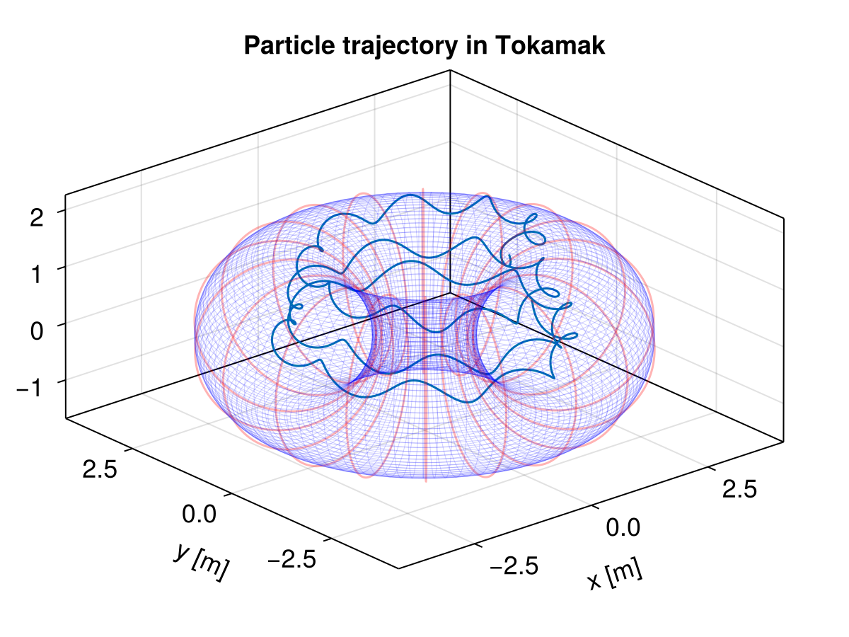 This example shows how to trace protons in a stationary magnetic field that corresponds to a Tokamak represented by a circle of coils. A excellent introduction video to Tokamak can be found here in Mandarin.