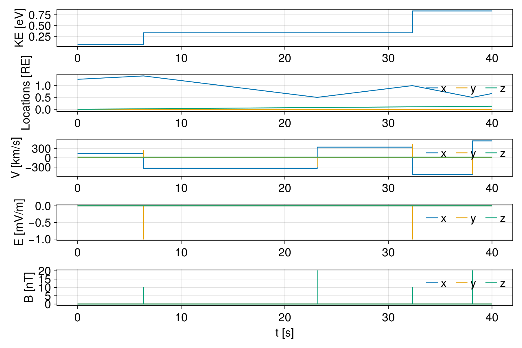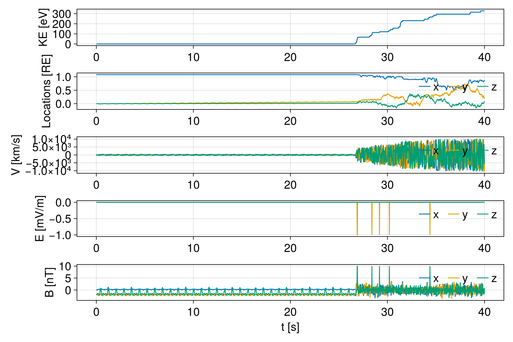 ylabels = ("KE [eV]", "Locations [RE]", "V [km/s]", "E [mV/m]", "B [nT]")