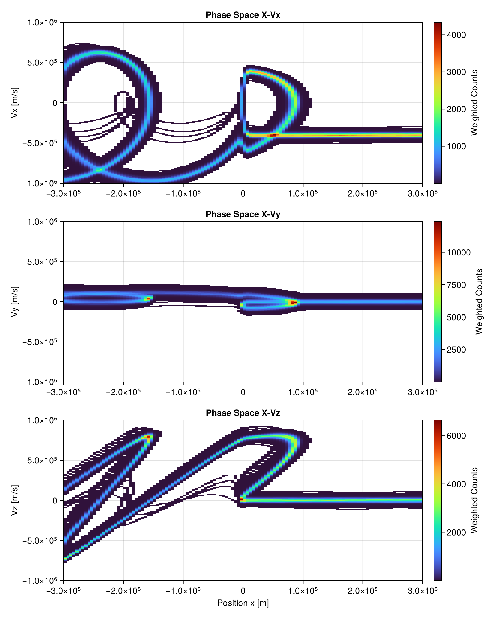 fig[3, 1], title = "Phase Space X-Vz", xlabel = "Position x [m]", ylabel = "Vz [m/s]"