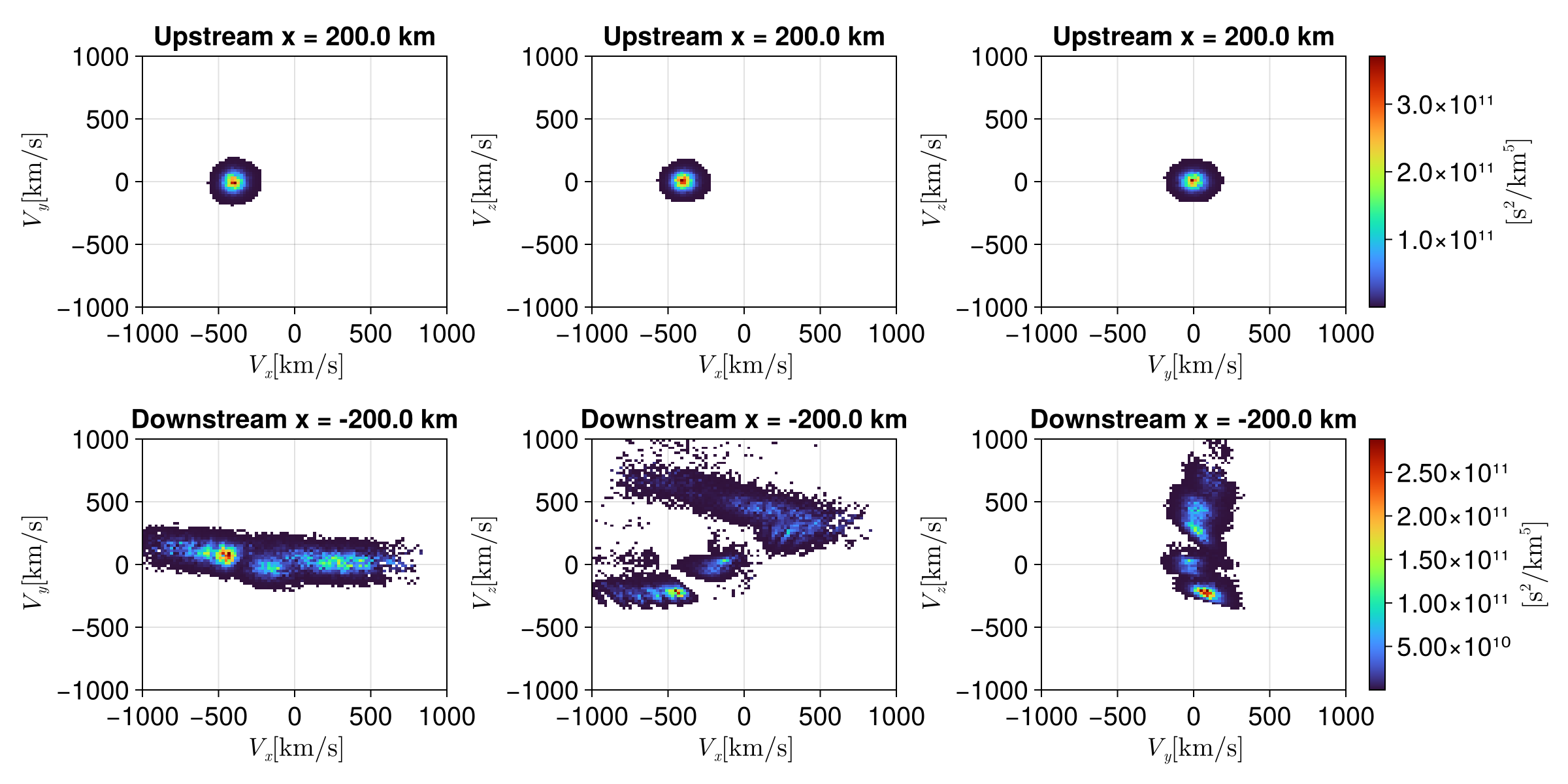 fig_backward = plot_shock_vdf(res_up_bw, res_down_bw, x_upstream, x_downstream)