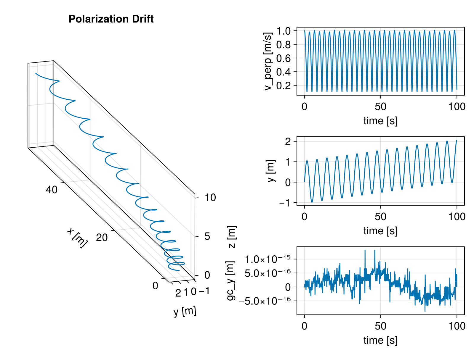 This example demonstrates a single proton motion under time-varying E field. More theoretical details can be found in Time-Varying E Drift, and Fundamentals of Plasma Physics by Paul Bellan.