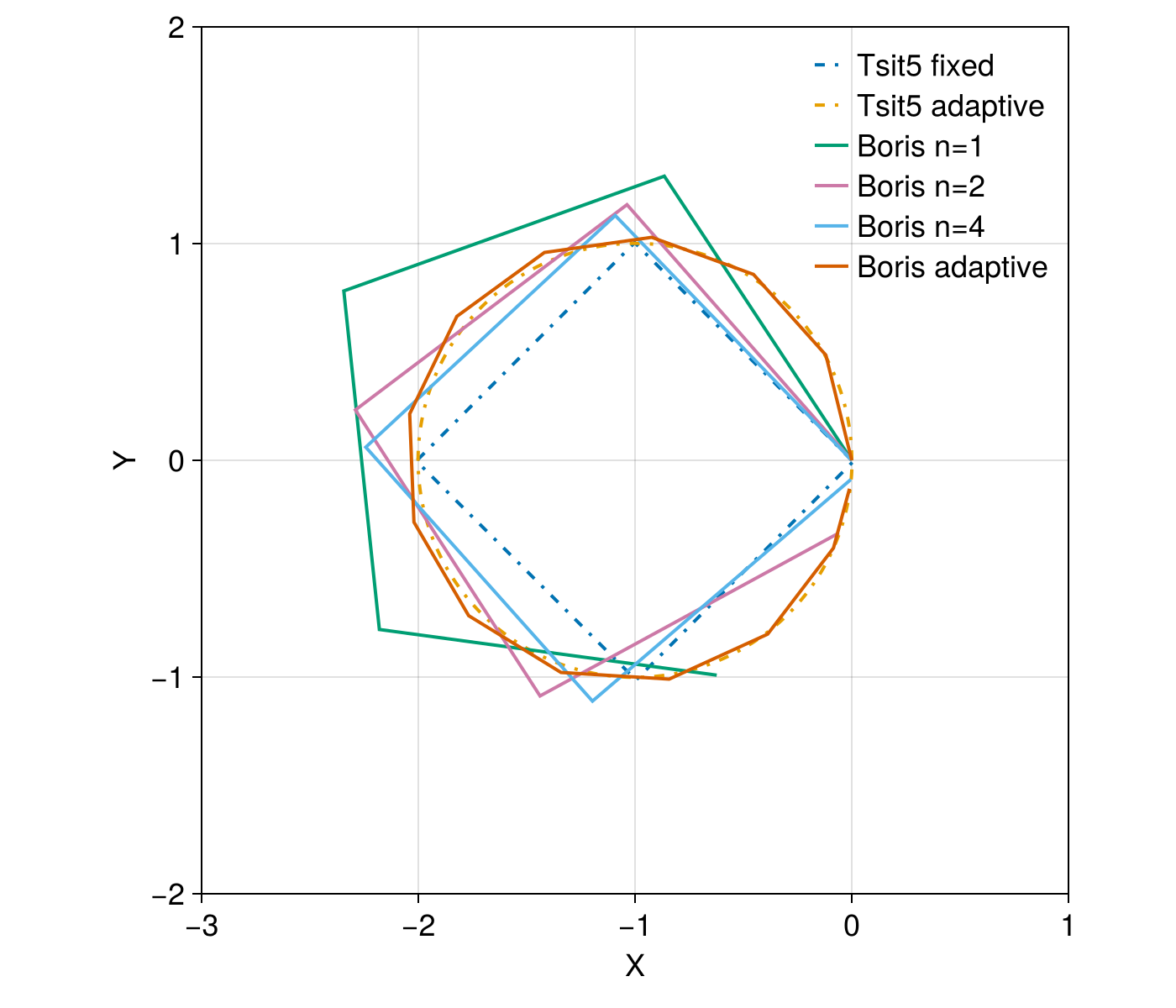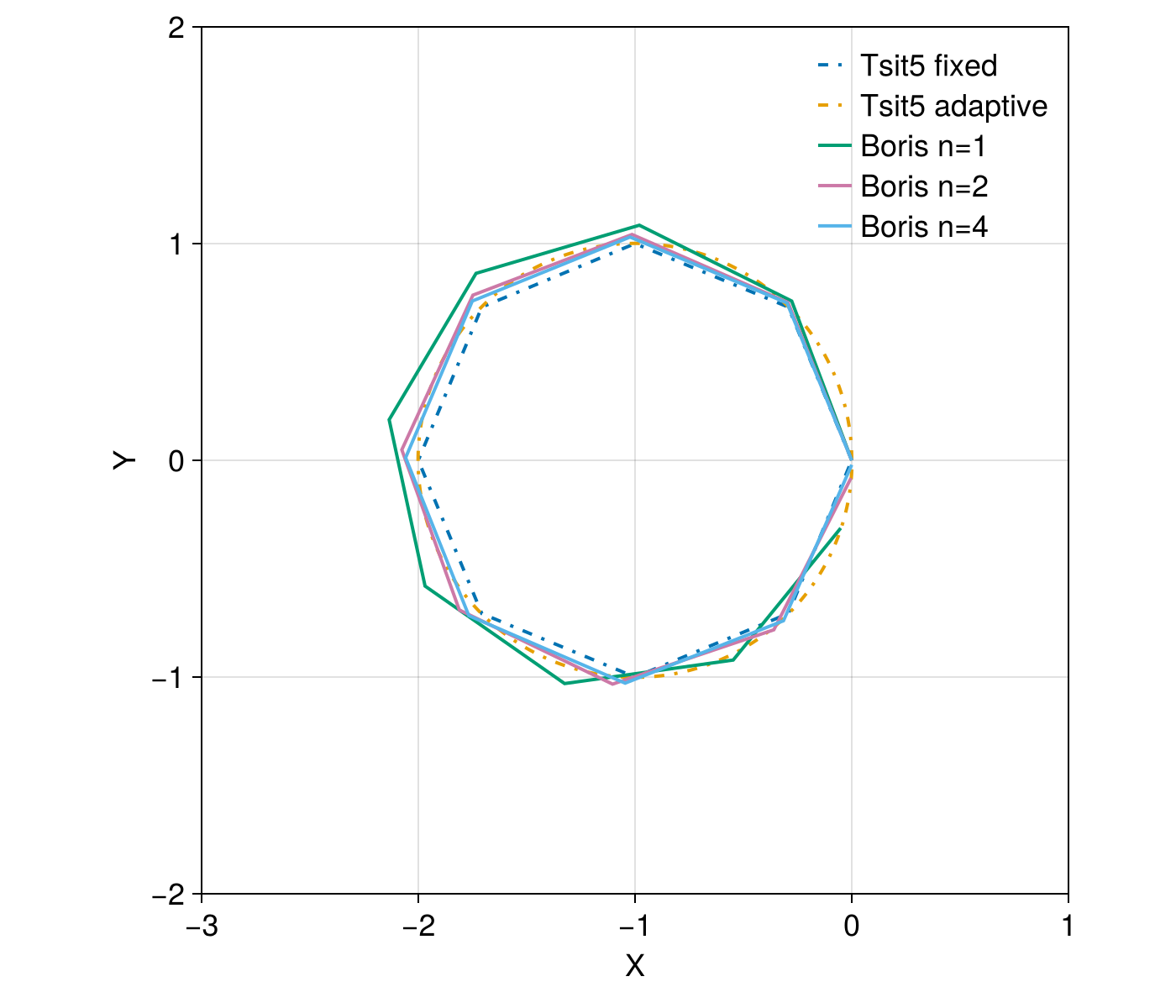f = plot_trajectory(sol_boris, sol1, sol2, sol_boris_2, sol_boris_4; alpha = 1)