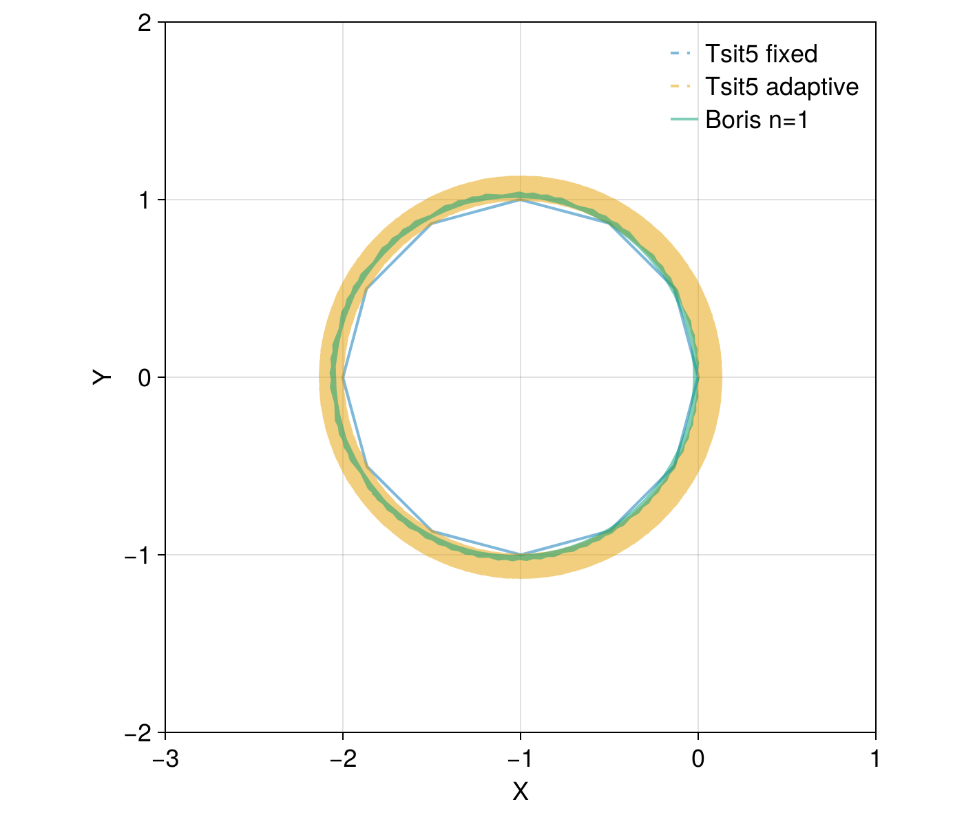 sol_boris_adaptive = TP.solve(prob, alg_adaptive)[1];Let's compare against the default ODE solver Tsit5 from DifferentialEquations.jl, in both fixed time step mode and adaptive mode: