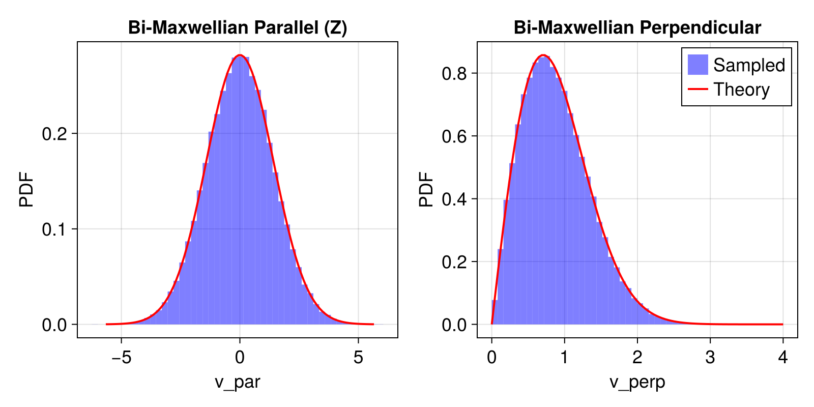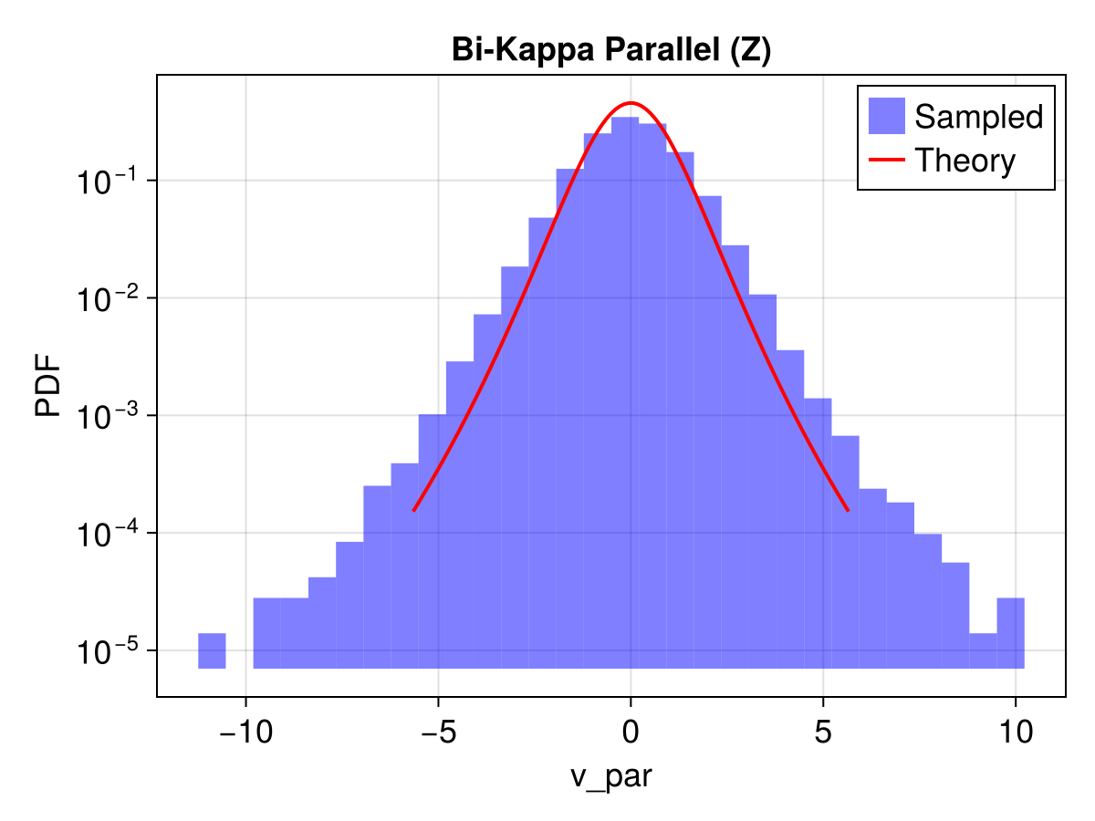This example demonstrates how to sample from various velocity distribution functions (VDFs) including Maxwellian, Bi-Maxwellian, Kappa, and Bi-Kappa distributions. We compare the sampled distributions with their theoretical probability density functions (PDFs).