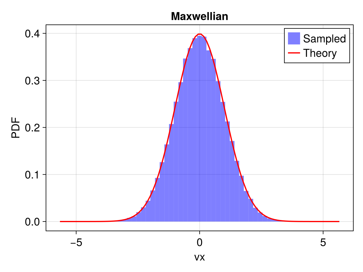 ax, v_grid, pdf_maxwellian.(v_grid, vth), label = "Theory", color = :red, linewidth = 2