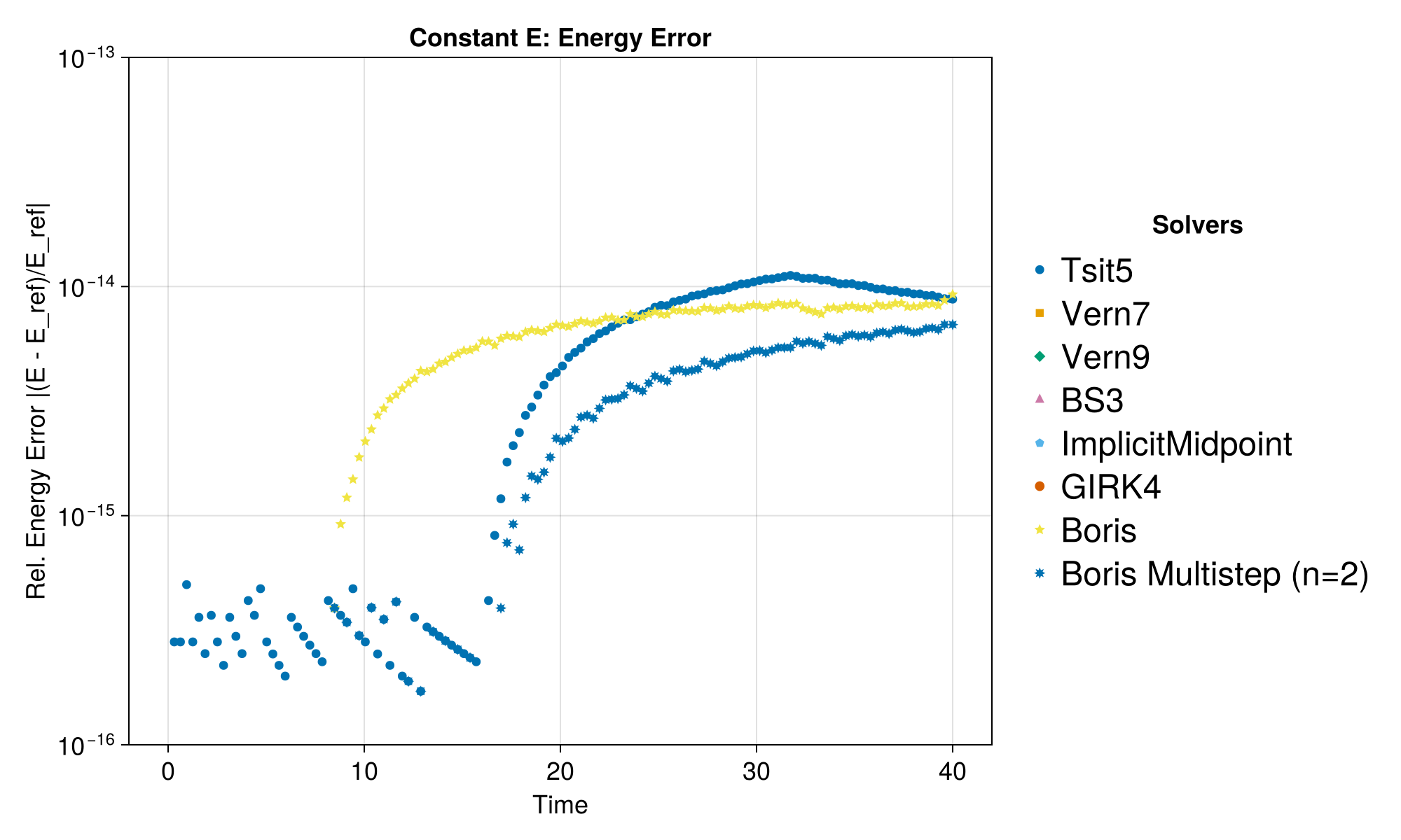 The tests are performed in dimensionless units with q=1, m=1. We compare three groups of solvers: