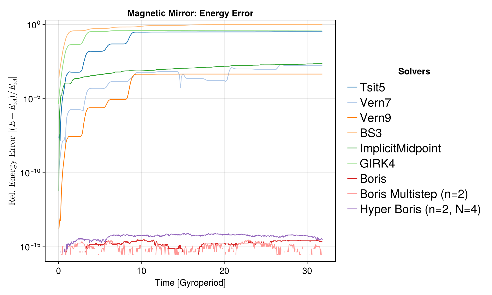 Similar to Case 2a, the Boris solvers systematically show a large error in this case, because of the initial half-step offset.