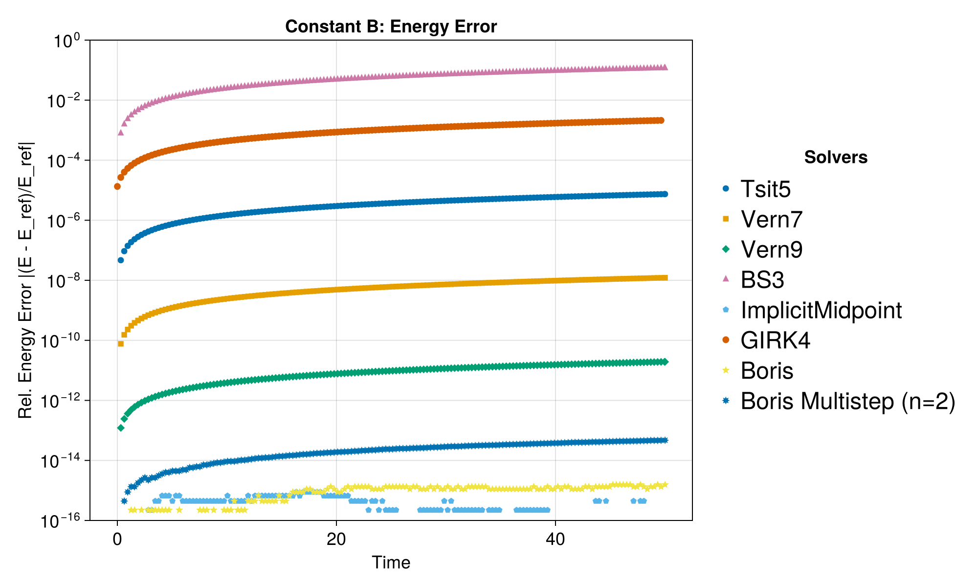 "Constant B", param1, x0_1, v0_1, tspan1, E_func1; dt = T / 20, ymin = 1.0e-16, ymax = 1.0