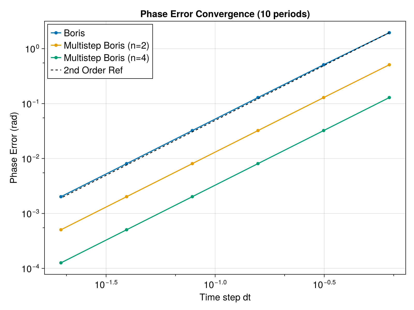This example demonstrates how to analyze the phase error of different particle solvers (Boris method and Multistep Boris method) in a simple cyclotron motion. We verify the order of accuracy by plotting the phase error against the time step size.